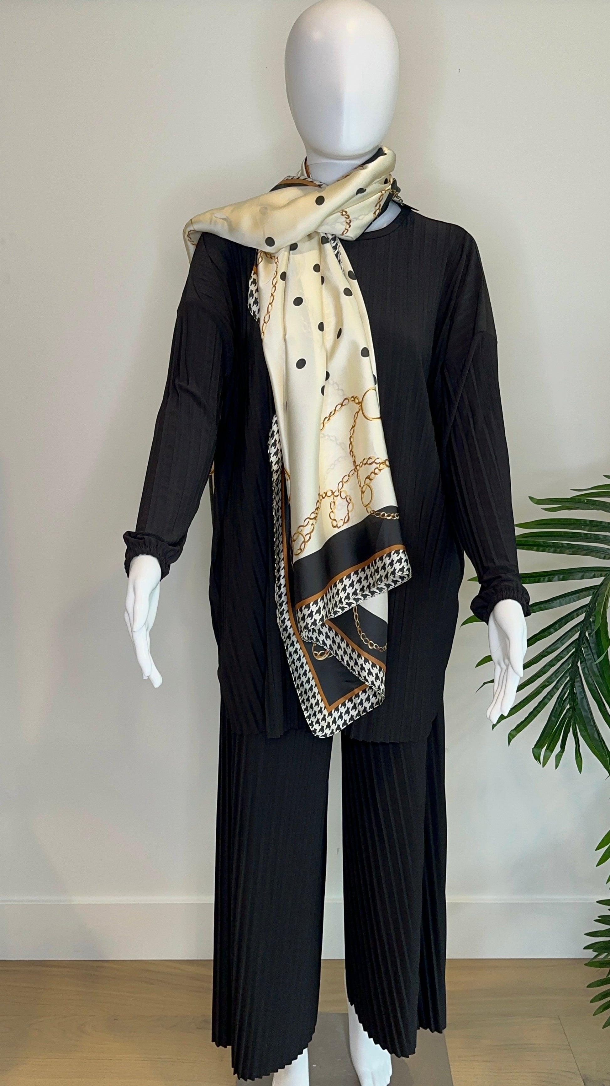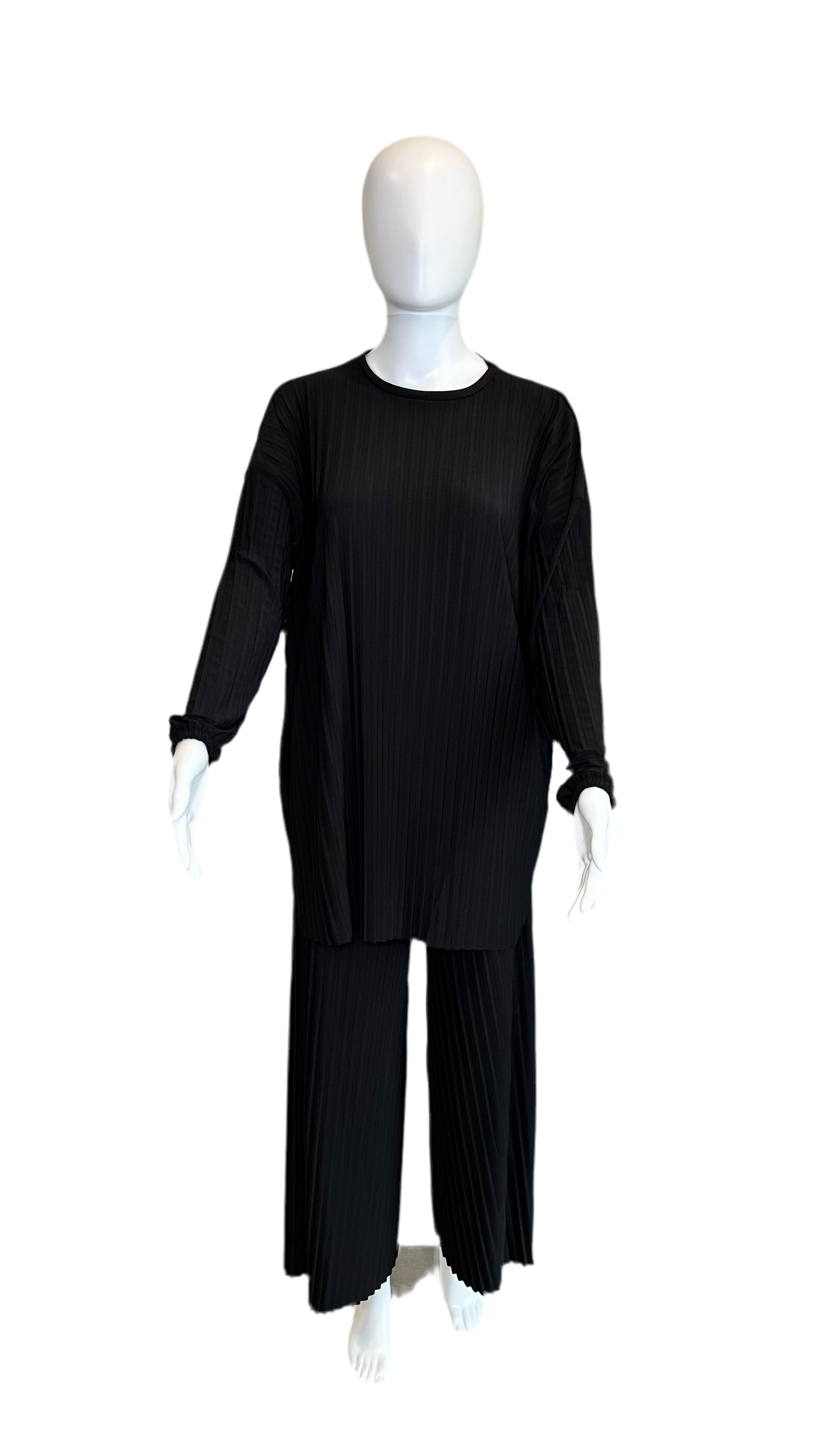 A chic and comfortable pleated set featuring a long top and wide-leg pants — perfect for everyday wear or dressed-up outings.