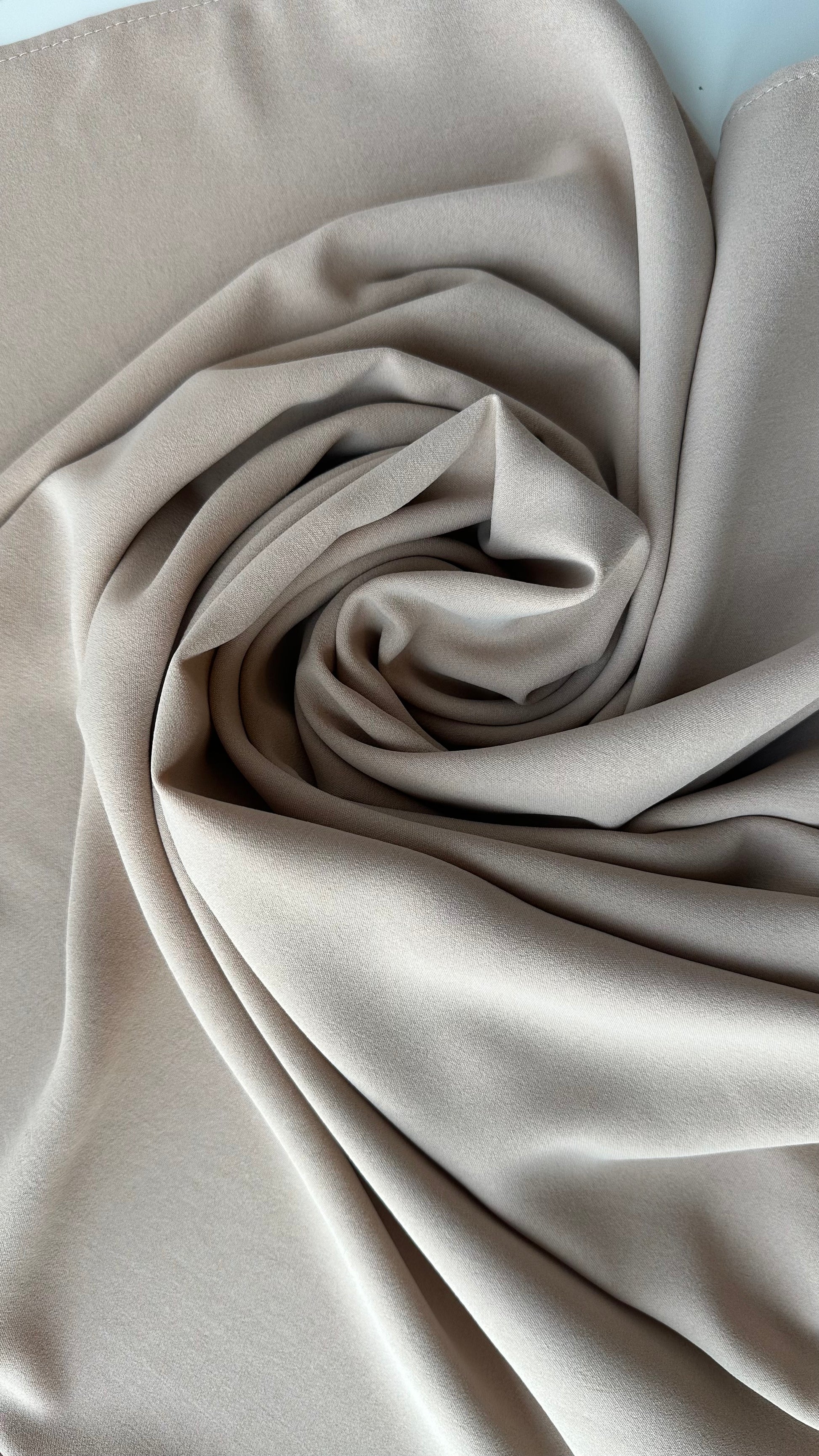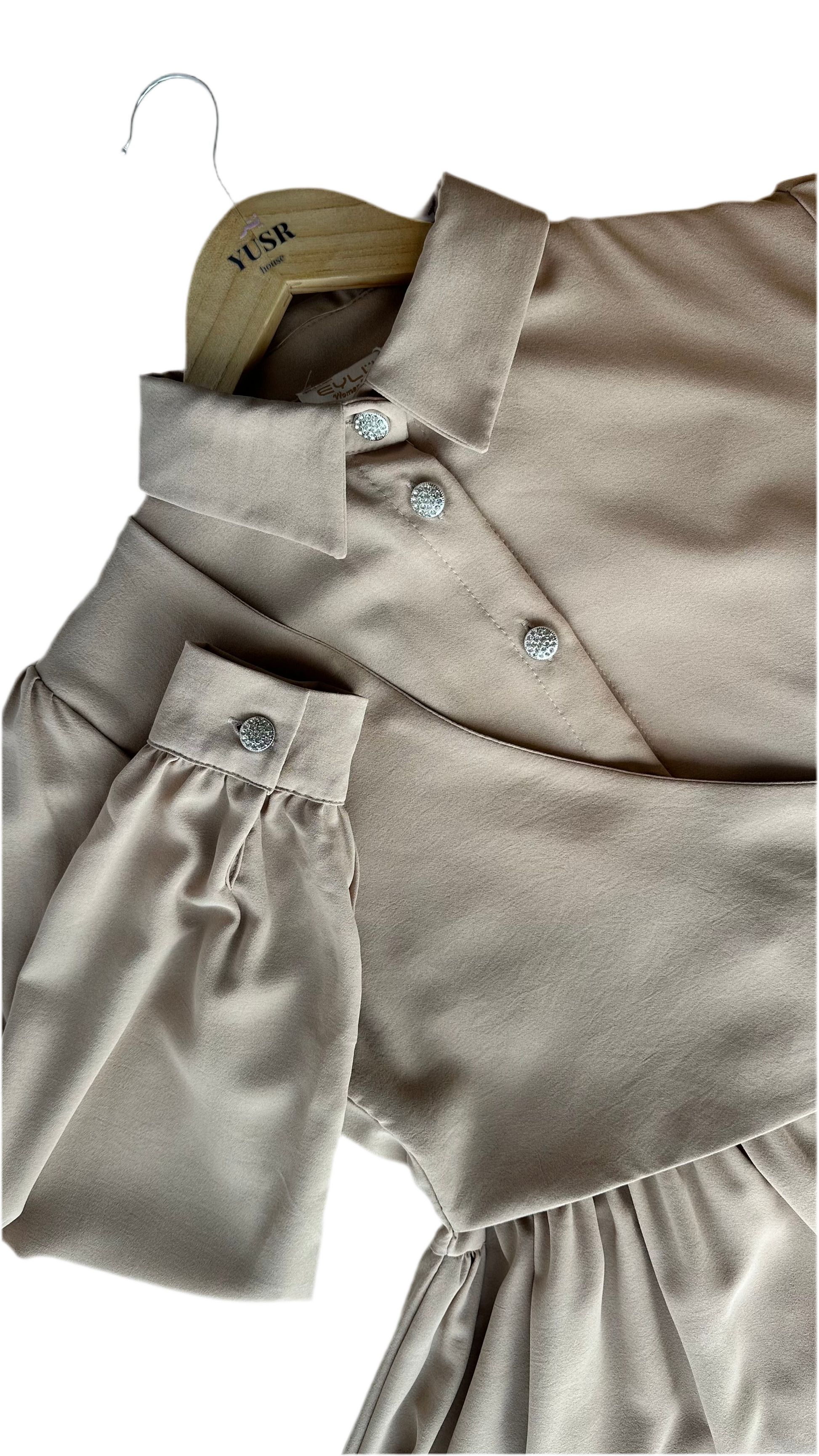 Modest and elegant beige dress featuring a wrap-style front for a flattering silhouette, complemented by delicate front buttons and slightly puffed sleeves with chic cuffs. Perfect for both formal occasions and refined everyday looks.