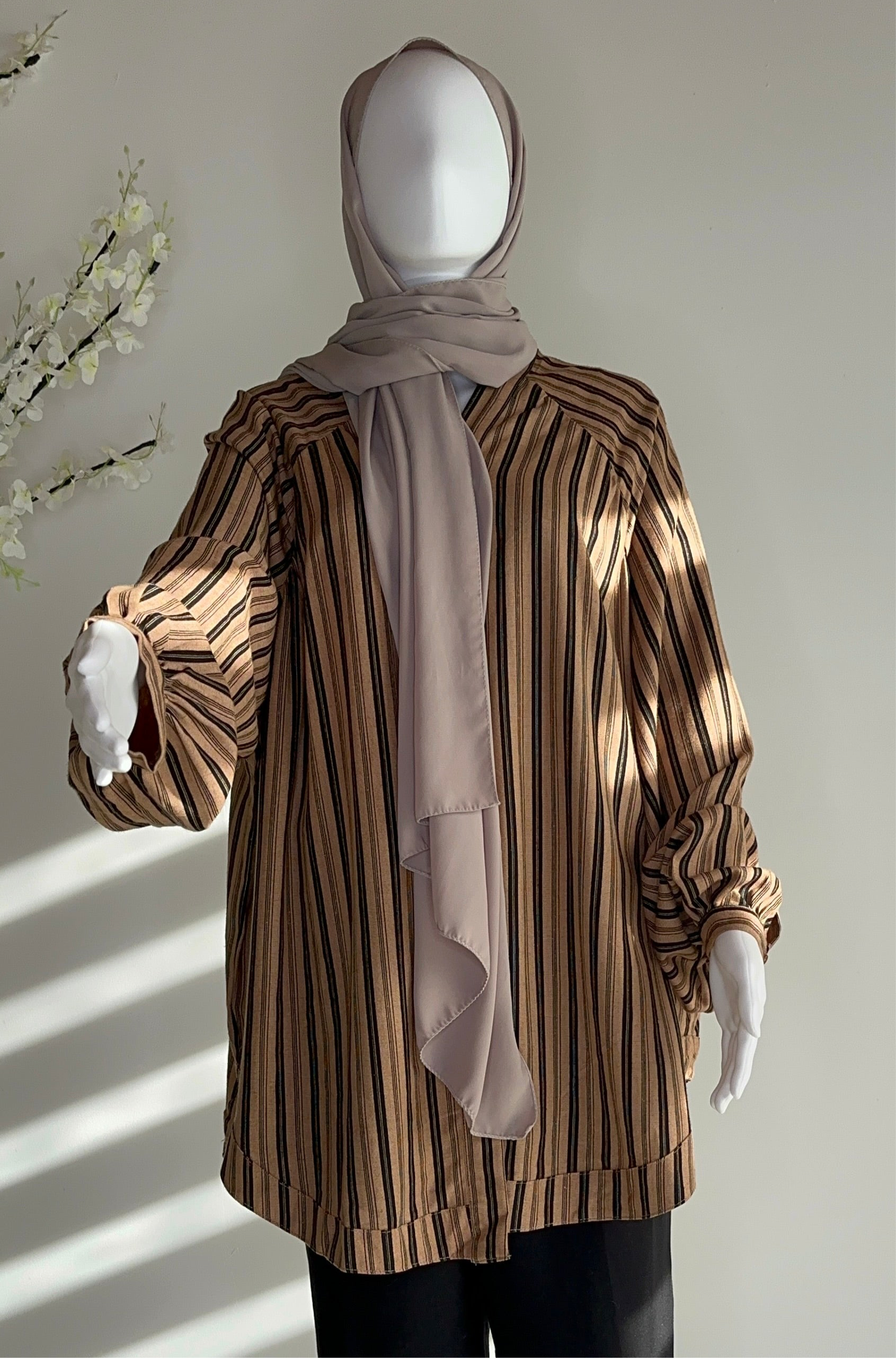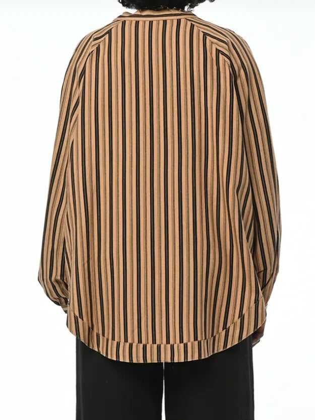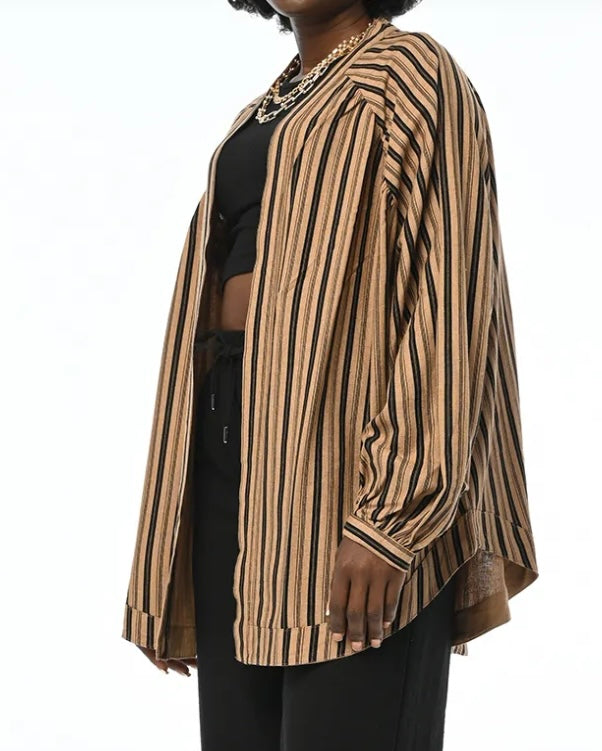 A loose-fit lightweight jacket in beige with vertical black stripes. Comfortable and effortlessly stylish, perfect for pairing with pants or jeans. Great for everyday outings or workwear